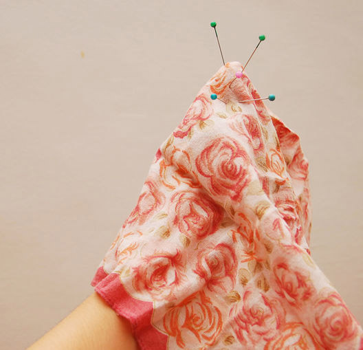 Slowly push the pins through the hanky and into your thumb (NOT REALLY! The carrot is pretending to be your thumb so you are perfectly fine – but you can really act like each pin is hurting sooo much!)