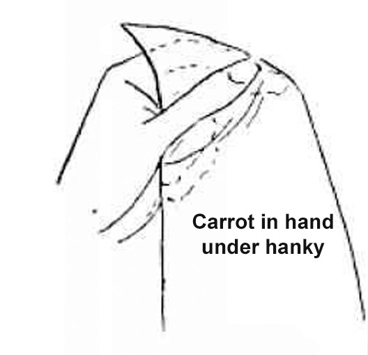 Place the handkerchief over your fist, and put the carrot part in the top of your fist, making it look as if your thumb is sticking up from your hand.